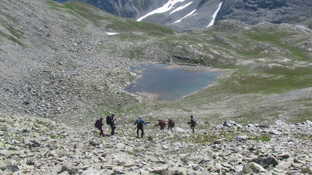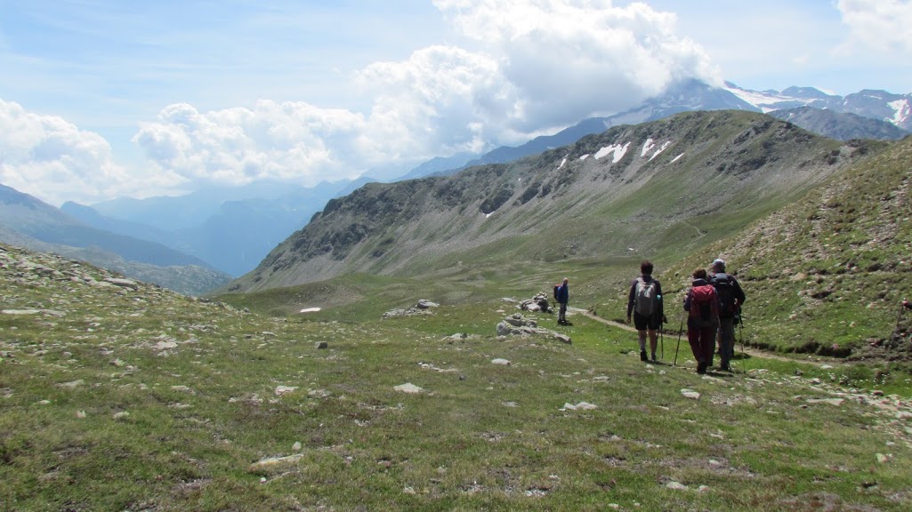 Due signore, una fanciulla e sette modesti anziani, che oggi non si sentono pronti per l’ambiziosa meta della punta Terrarossa, parcheggiano al Passo del Sempione, 2005, in prossimità del cilindro rosa dell’hotel Monte Leone. La giornata è bella. Il gruppo della nostra serie A ci ha preceduti di poco, diretto al Wasenhorn. Ci dirigiamo a nord ovest attraversando i pianori del passo sul sentiero evidente e raggiungiamo le baite di Höpsche, 2017. Primo piccolo strappo e di nuovo un tratto molto lungo di morbida salita, “traversando” in direzione ovest. Altro strappo in salita più seria quando arriviamo ad imboccare il vallone che separa gli Staffelgrat dal Tochuhorn. La direzione ora è nuovamente nord ovest. La pendenza si ammorbidisce ancora entrando nell’ampio anfiteatro dominato dalla nostra meta finale. Ci concediamo una breve pausa. Siamo a Undre Rossusee, 2472, in prossimità del laghetto inferiore quasi asciutto. Saliamo alla bocchetta (Usserie Nanzlickke) che separa la valle del Sempione dalla Nanztal, 2602, viriamo a destra (nord) e raggiungiamo la vetta sud dello Spitzhorli, 2729, dopo 2 h 15'. Il panorama, da questa cima frequentata più d’inverno che d’estate, è eccezionale. Dopo la pausa per l’indispensabile contemplazione, proseguiamo con breve discesa e risalita fino alla vetta nord, 2726, che per la cartina elvetica è quella vera. Scendiamo ancora ad una cima leggermente più bassa, sempre verso nord, forse il Fülhorn, 2677. Questa e i due Spitzhorli sono contrassegnate da grossi ometti di sasso. Torniamo al piccolo intaglio fra le due prime cime e, girando a sinistra, scendiamo verso oriente (valle del Sempione) il ripido pendio sassoso che ci porta in riva al laghetto superiore (Obre Rossusee), dove ci fermiamo per ristorarci dopo 40'. Un’oretta più tardi ripartiamo diretti a sud fino a raggiungere il sentiero percorso in salita e chiudere così il nostro solito anello. Scendiamo a Undre Rossusee e di qui ripercorriamo con tutta calma quella che ora è una dolce discesa. Questa bellissima valle, ad occidente di quella principale del Sempione, è decisamente più fortunata e, quindi, più tranquilla di quella altrettanto bella che si trova più a sud e sale da Engiloch. Qui i colpi di mortaio dell’esercito confederato spesso limitano la libertà dei tanti escursionisti e sci-alpinisti. Dopo 1 h 40’ siamo al Passo del Sempione e rientriamo in patria dissertando sul senso dei colpi di mortaio nell’era delle testate nucleari.