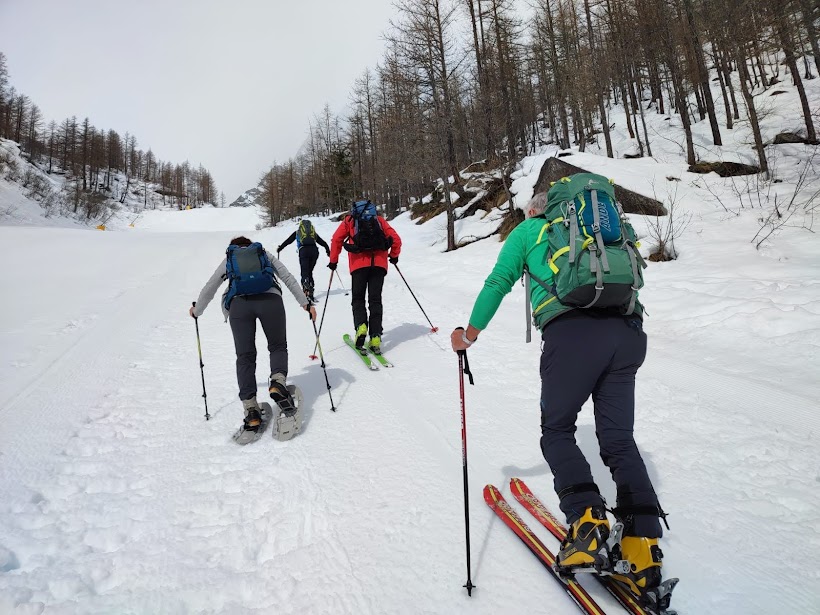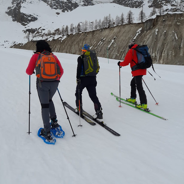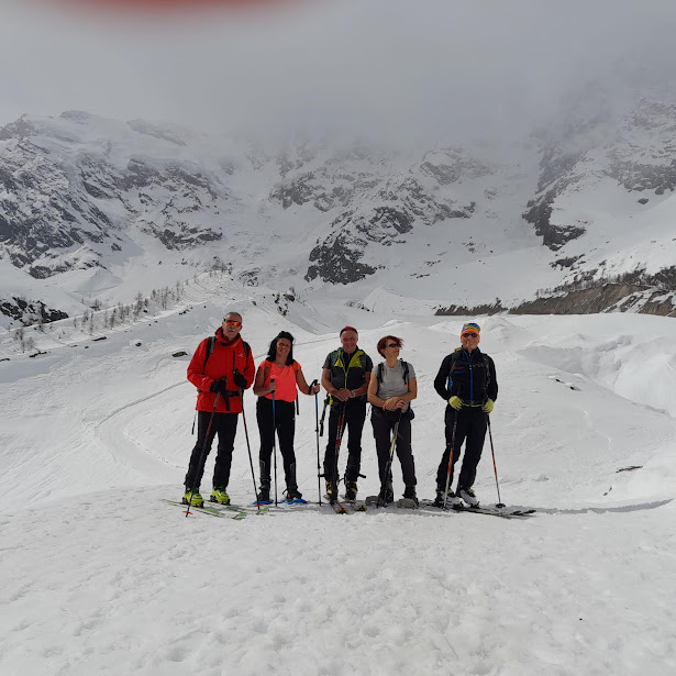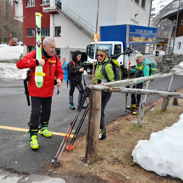 Al campo base di Piedimulera abbiamo la piacevole sorpresa di un plurinonno, oggi precettato in famiglia, che si presenta al ritrovo per offrirci il caffè. Questo è senso del dovere! Un anziano viene accompagnato dall’unico medico di servizio a sciare in pista. Gli altri tre, con sci e pelli di foca, vengono guidati nella salita da due badanti attrezzate con ciaspole.