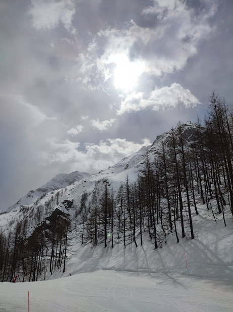 All’arrivo a Macugnaga la vista del Monte Rosa ci è negata dalle nuvole, mentre il sole splendente dalle parti del Monte Moro dirotta lì i due pistaioli. Con gli sci ai piedi già a Pecetto, alla partenza della seggiovia del Belvedere, 1358, in cinque affrontiamo con tutta calma il morbidissimo pendio che sale verso l’Alpe Burki, 1581, e la stazione intermedia della seggiovia, 1613. La sorpresa, non così gradita, è la pioggia.