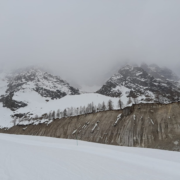 Gli amici che sciano in pista al Monte Moro adesso sono completamente nella nebbia e si sposteranno qui al Belvedere, ma anche a loro verrà riservata un po’ di pioggia, più tardi. Raggiungiamo il Belvedere e la stazione d’arrivo della seggiovia, 1904. L’ultima volta che ero passato di qua in inverno, quattro anni fa, il percorso di salita poteva già entrare nella morena del ghiacciaio prima del Rifugio Città di Saronno, lasciando la conca del Belvedere sulla sinistra. Adesso il ritiro sempre più rapido del ghiacciaio fa sì che le pareti laterali dell’enorme avvallamento che lo contiene franino su sé stesse.