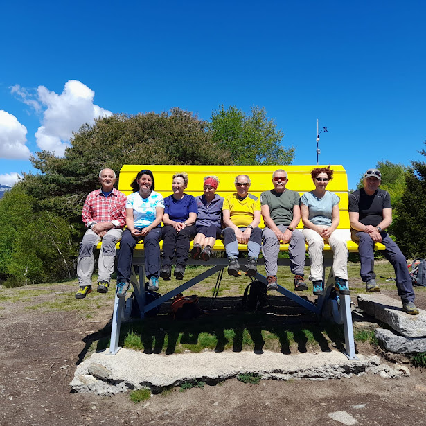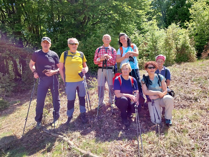 Passiamo anche da Cima Ologno, 1132, ci facciamo fotografare su una delle tanto discusse panchine giganti e l’ultima dolce risalita ci porta sul Monte Carza, 1116 (un’ora e mezza da Cima Tondone). Pochi metri più sotto, in un pianoro fra le rocce recintato ed ora attrezzato con comodi tavoli, pranziamo al sole caldo di questa bellissima giornata strappata, per pura fortuna, ad un periodo più invernale che primaverile. Riprendiamo la discesa seguendo prima la pista sterrata e poi un tratto della strada che da Cheglio sale a Colle, già incrociata al mattino al Passo di Piazza.