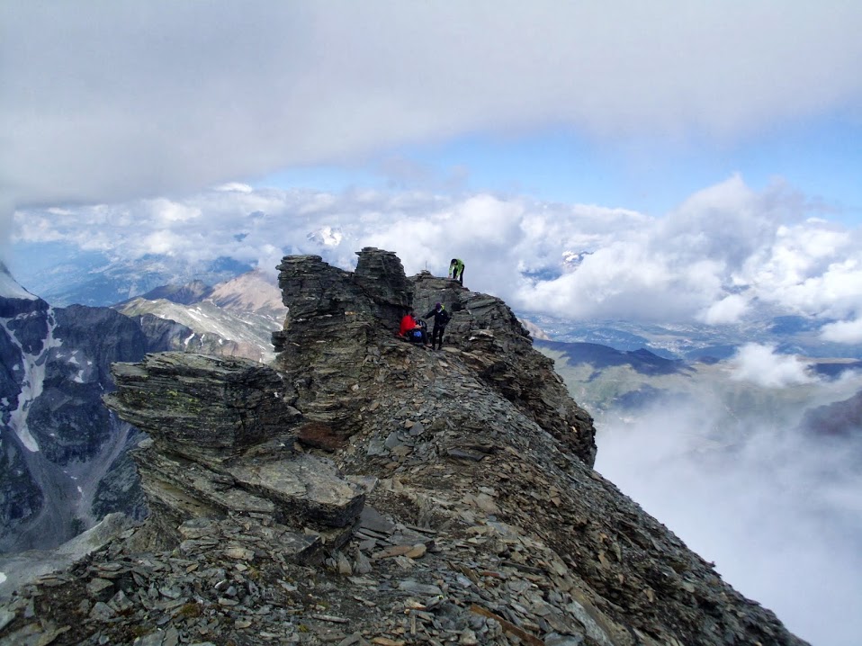 Raggiungiamo il filo di cresta finale e, finalmente, il terreno sotto i nostri piedi torna ad essere solido. Puntiamo a sinistra ed in pochi minuti siamo in vetta, 3272. Poco più di due ore dal Passo di Boccareccio. I forti sono già seduti a riposare, ma ce l'abbiamo fatta tutti. Si dovrebbero vedere Binn a nord e Devero a est, oltre ad una splendida corona di cime dell'Oberland Bernese, ma una barriera di nuvoloni neri quasi ci soffoca e ce lo impedisce. Dovremo tornare qui per goderci il panorama.