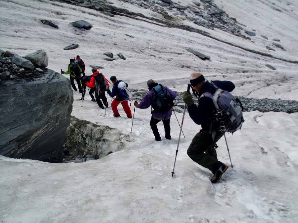 Questo tratto è molto ripido, paragonabile a pochi altri della zona quali il Passo del Gatto al Monte Tagliaferro, e siamo al Passo in poco meno di due ore. Ricordiamo che stiamo parlando di escursioni. Qualche nuvola incornicia le cime e, per ora, rende solo più spettacolare il panorama indescrivibile. Siamo sulla linea di confine, nella parte superiore dell'Helsegletscher. Viriamo a destra, in direzione est, entrando in territorio svizzero.