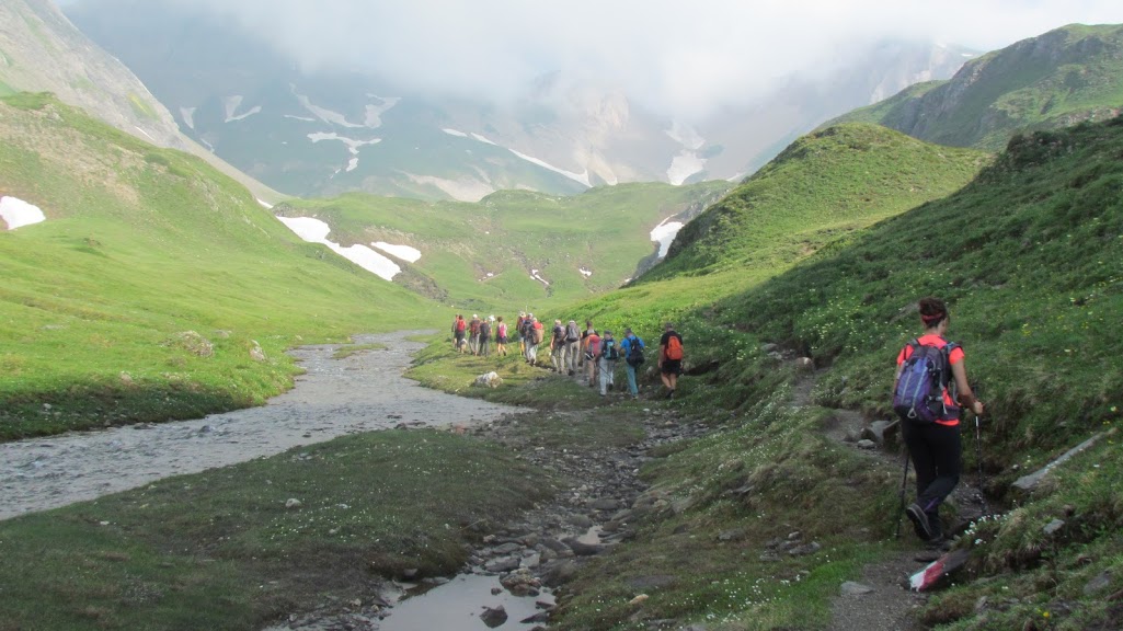 C’è il sole, ma sono previste nuvole più o meno asciutte nel corso della giornata. Siamo in diciassette: il rientro di un fantasma allieta undici pensionati, una signora, due quasi giovanotti e due leggiadre fanciulle. Con una di loro c’è Vicky, affettuosa e ubbidiente femmina di Pastore Australiano. Ad Asia non dirò niente. La guida walser di oggi, insieme ad altri esperti, rende tutti tranquilli, così come la presenza dell’èquipe medica di turno. Da Riale, 1733, saliamo sul sentiero che taglia i tornanti della strada per il Maria Luisa, in attesa del sole. Dopo 1 h 05’ siamo al rifugio, 2160. Una marmotta seduta all’ingresso coordina la reception. Rivolti alla diga del Lago Toggia, saliamo alla nostra sinistra (nord – ovest) ed arriviamo alla Baita Darioli, 2245 (15’), dove sostiamo brevemente intorno alla fontana. Il sentiero G28 è ben segnato e costeggia il Rio Rotental, ricco d’acqua. Entriamo nella valle paradisiaca che gli dà il nome. Procediamo in piano, attraversando qualche piccolo nevaio, e guadiamo in ordine sparso, in funzione delle singole capacità natatorie. Ci ricompattiamo sulla sua destra orografica. Ancora pendenze morbide fino a che il gioco si fa duro. Sulla nostra sinistra Corno Mutt e Corno Brunni ci sovrastano. Il saggio passo della guida, che calma i bollenti spiriti di un varesotto in eccesso di forma, tiene tutti in gruppo. Solo il grande nevaio più in alto (1 h 30’), ben battuto dall’avanguardia, produce due rinunce dovute solo ad una “giornata no”. La neve tiene, non servono i ramponi (che, comunque, sono nei cassetti di casa). Dopo 30’, oltre la neve, arriviamo ad una selletta dalla quale l’ultimo ripido tratto porta in vetta, 2968 (20’). Lo scosceso versante nord dà sulla Valle Corno. Il panorama superbo ora è offuscato dalle nubi. Il caldo del fondovalle è un lontano ricordo. Ritorniamo alla selletta e, anziché dal sentiero di salita (destra), grazie alla fiducia della guida scendiamo con prudenza da un nevaio molto ripido verso oriente (sinistra). In 30’ raggiungiamo un ampio pianoro dove ci ristoriamo. Siamo nel vallone fra Punta di Valrossa e Punta Elgio. Scendiamo verso la Valrossa, costeggiando un laghetto che affiora dalla neve e, dopo 20’, incontriamo una fascia molto ripida di roccia friabile. L’attraversiamo con cautela, con gli esperti impegnati ad aiutare i meno sicuri. Ci insegna tante cose vedere Vicky che non vuole allontanarsi di un centimetro dalla sua padrona: ne avverte l’apprensione su questo terreno “complicato”. L’homo sapiens dagli animali può soltanto imparare. Dopo 30’ siamo in sicurezza, tutti rilassati, e lungo ripidi prati raggiungiamo i pianori della Valrossa dove le vacche serafiche pascolano. In 45’ siamo al Rifugio Maria Luisa e in 55’ arriviamo alle auto a Riale. Mentre entriamo al bar della Cascata per brindare al compleanno del nostro neurologo, inizia a piovere.