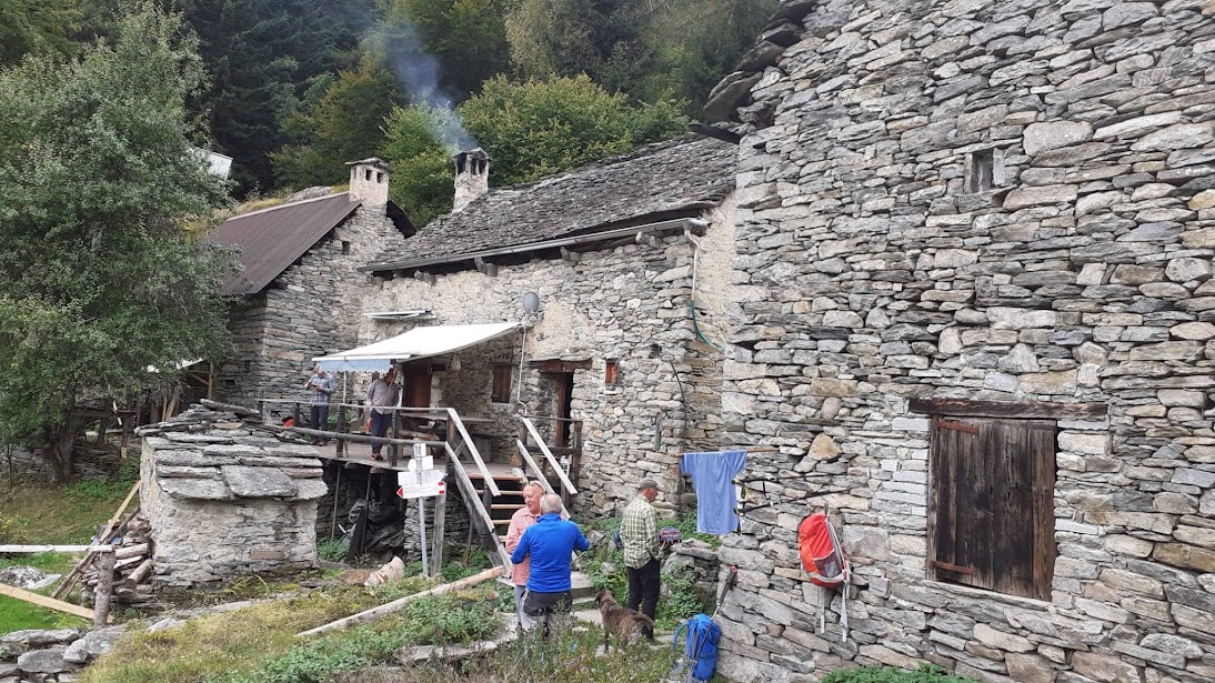 La discesa lungo il sentiero GTA, prima pianeggiante in direzione ovest ed un po’ esposto e poi in ripida discesa verso l’Alpe Salviggia, induce i nostri medici a sottoporci preventivamente ad un alcol test su un asse d’equilibrio predisposto allo scopo. Superato il test, raggiungiamo Salviggia e da qui, in parte lungo la strada e in parte lungo il sentiero per evitare le due gallerie, Ponte Cantone (un’ora e un quarto), dove ci aspettano le auto parcheggiate al mattino.