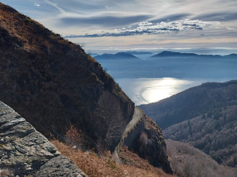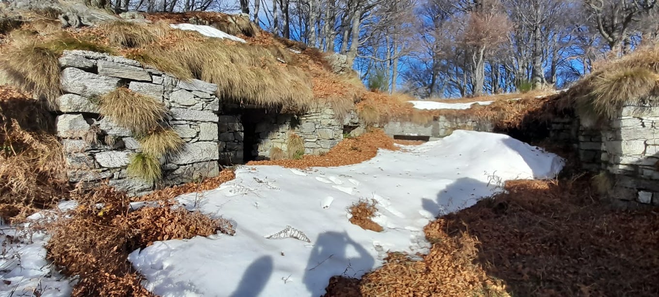 Prima del bivio per l’Alpe Morissolo ci fermiamo per una parca colazione, in previsione delle libagioni che ci attendono. Qui sale, non indicata, una traccia sulla sinistra, in mezzo alla vegetazione fortunatamente quasi invernale, su quella che sarebbe una bellissima mulattiera della Linea Cadorna. Un altro Paradiso perduto nel nostro territorio, ahimè! Sui cartelli indicatori qui si risparmia decisamente. Qualche tornante in mezzo alle felci ingiallite e, sulla dorsale, invertiamo decisamente la rotta verso ovest e poi sud. In dolce salita, pestando gli ultimi residui di neve, arriviamo in vetta al Monte Morissolino, 1410, dopo un’ora e tre quarti dal campo base di Calpera.