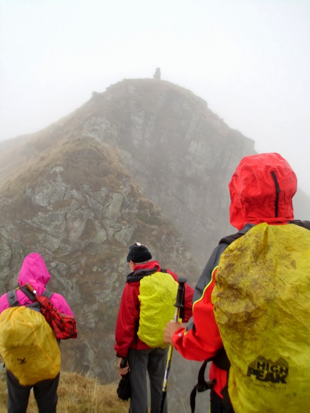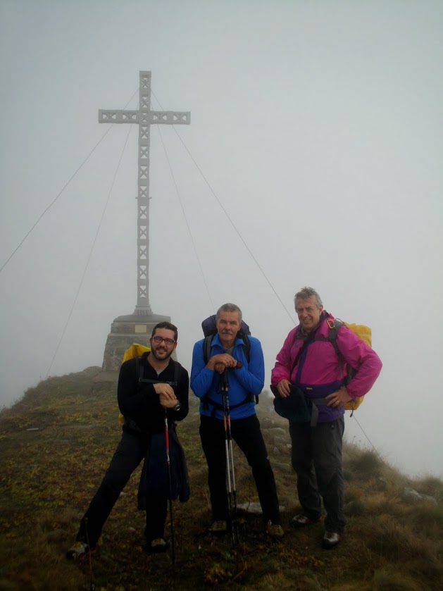 Sono solo le 9.00. Cerco, quindi, di infondere fiducia negli amici, perché piove sempre, ma non è ancora “tarda mattinata”. Nella baita rifugio si fa colazione con calma, in attesa delle schiarite. Ricomincia la salita su traccia non sempre segnata ed evidente. Siamo sulla dorsale fra Antrona e Bognanco, diretti a ovest. Passiamo dalla croce di granito che ricorda la tragica morte di un ragazzo. Il terreno è bagnato ed infido: niente di trascendentale, ma scivolare su questi ripidi pendii erbosi è vivamente sconsigliato. Dopo poco più di un'ora e mezza dal Colle siamo in vetta, 2249. Lo splendido panorama ci è negato, pioviggina ancora.