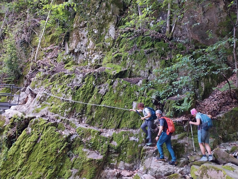 Sopra di noi, alla nostra destra, forma una bella cascata. Il primo tratto è ripido, con gradini scavati nella roccia, e favorisce il risveglio muscolare. Dopo una cappelletta dedicata a Maria il pendio si addolcisce e camminiamo nel verde in deliziosa ombra. Arriviamo a Ca' Burtulina, 485, e proseguiamo per Cosasca, 550. Giriamo per l'antico borgo, in ordine, pulito, dove c'è vita. Proseguiamo verso nord fino al Santuario della Madonna delle Grucce, 570, ristrutturato in stile “moderno”. Camminiamo da un'ora.