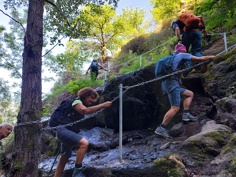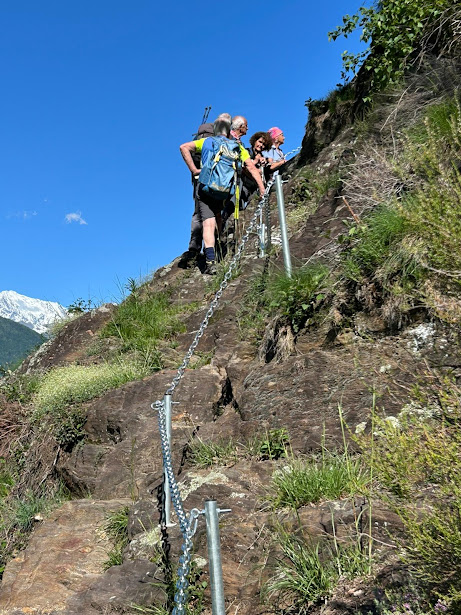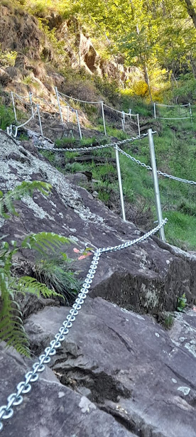 Dopo una breve pausa, invece di salire come un'anno fa direttamente verso l'Alpe Pra Lavarda, proseguiamo verso nord e scendiamo ad attraversare la valletta del Rio Porcelli, che dalla cartina sembrerebbe il Rio Varione. C'è poca acqua. Parlare di guado sembra esagerato. Qui inizia veramente il Sentiero della Sposa. Una catena, un ponticello metallico e poi si sale decisamente. Tutto profuma di nuovo, gradini d'acciaio, paletti, catene.