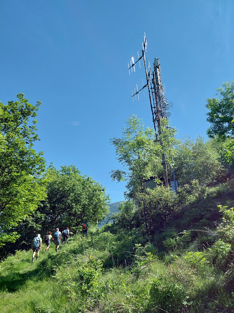 E tutto è piazzato da esperti. Non c'è nulla di particolarmente esposto e pericoloso, però è un terreno severo e le attrezzature danno tranquillità e sicurezza anche a chi è abituato solo ai sentieri turistici. Qualche saliscendi, una breve pausa colazione e ci incrociamo con un gruppo di colleghi escursionisti del Verbano provenienti da Trontano. In piano passiamo dall'Alpe Caudera con i suoi castagni secolari e, dopo un'ora, siamo a Corte Mozzio, 655, dove arriva da Trontano la strada, cementata nell'ultimo tratto, e dove si trovano gli alti ripetitori che si vedono anche da Domodossola.