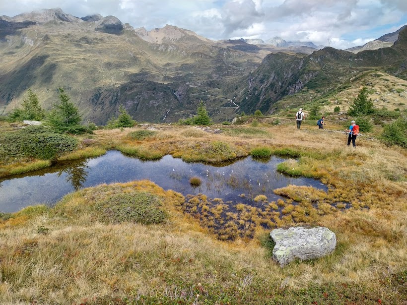 Oggi, per evitare partenze troppo veloci di cui risento solo io, gli amici mi mettono in testa al gruppo a fare il passo, da vecchio saggio o da “vaca vegia” a seconda dei punti di vista. Ci dirigiamo a nord, in dolcissima salita fino a Frua di Sopra. Qui, al bivio per l’Alpe Ghighel, inizia il sentiero G22a che fa parte del TB (Tour del Basodino). E’ evidente, diretto a oriente, destra, e il pendio diventa subito impegnativo. Nonostante il passo del vecchio, dopo un’ora siamo all’Alpe, 2125. Proseguiamo in direzione sud est, inizialmente in salita fino a congiungerci con il sentiero G22 proveniente dal Lago Castel, poi in piano fino al guado del Rio Scelp, a quota 2200 circa.