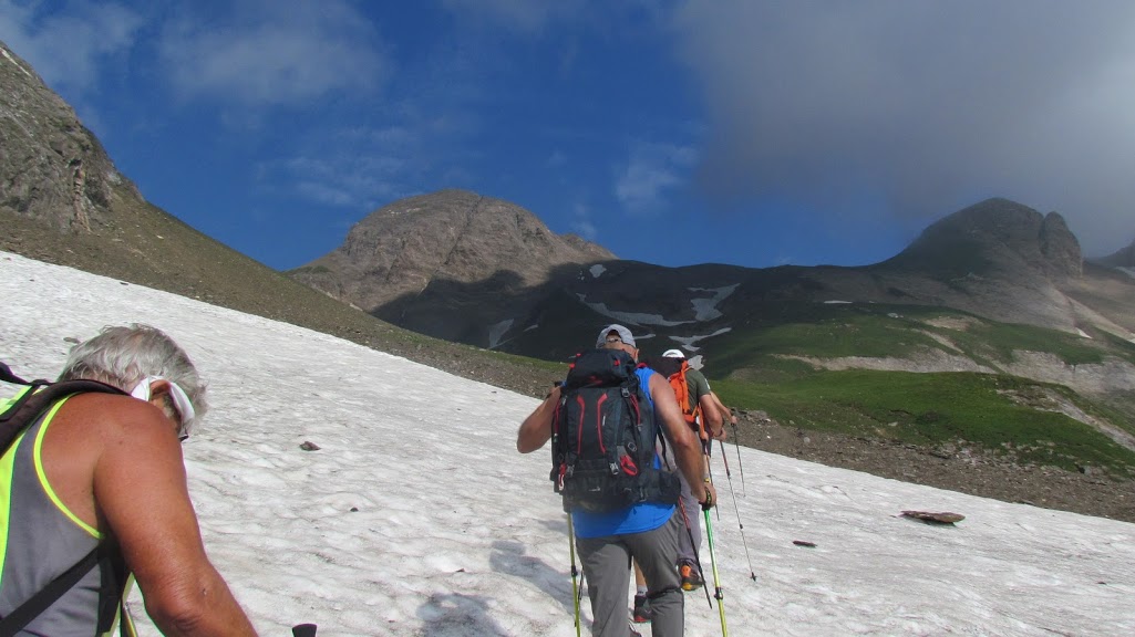 C’è il sole, ma sono previste nuvole più o meno asciutte nel corso della giornata. Siamo in diciassette: il rientro di un fantasma allieta undici pensionati, una signora, due quasi giovanotti e due leggiadre fanciulle. Con una di loro c’è Vicky, affettuosa e ubbidiente femmina di Pastore Australiano. Ad Asia non dirò niente. La guida walser di oggi, insieme ad altri esperti, rende tutti tranquilli, così come la presenza dell’èquipe medica di turno. Da Riale, 1733, saliamo sul sentiero che taglia i tornanti della strada per il Maria Luisa, in attesa del sole. Dopo 1 h 05’ siamo al rifugio, 2160. Una marmotta seduta all’ingresso coordina la reception. Rivolti alla diga del Lago Toggia, saliamo alla nostra sinistra (nord – ovest) ed arriviamo alla Baita Darioli, 2245 (15’), dove sostiamo brevemente intorno alla fontana. Il sentiero G28 è ben segnato e costeggia il Rio Rotental, ricco d’acqua. Entriamo nella valle paradisiaca che gli dà il nome. Procediamo in piano, attraversando qualche piccolo nevaio, e guadiamo in ordine sparso, in funzione delle singole capacità natatorie. Ci ricompattiamo sulla sua destra orografica. Ancora pendenze morbide fino a che il gioco si fa duro. Sulla nostra sinistra Corno Mutt e Corno Brunni ci sovrastano. Il saggio passo della guida, che calma i bollenti spiriti di un varesotto in eccesso di forma, tiene tutti in gruppo. Solo il grande nevaio più in alto (1 h 30’), ben battuto dall’avanguardia, produce due rinunce dovute solo ad una “giornata no”. La neve tiene, non servono i ramponi (che, comunque, sono nei cassetti di casa). Dopo 30’, oltre la neve, arriviamo ad una selletta dalla quale l’ultimo ripido tratto porta in vetta, 2968 (20’). Lo scosceso versante nord dà sulla Valle Corno. Il panorama superbo ora è offuscato dalle nubi. Il caldo del fondovalle è un lontano ricordo. Ritorniamo alla selletta e, anziché dal sentiero di salita (destra), grazie alla fiducia della guida scendiamo con prudenza da un nevaio molto ripido verso oriente (sinistra). In 30’ raggiungiamo un ampio pianoro dove ci ristoriamo. Siamo nel vallone fra Punta di Valrossa e Punta Elgio. Scendiamo verso la Valrossa, costeggiando un laghetto che affiora dalla neve e, dopo 20’, incontriamo una fascia molto ripida di roccia friabile. L’attraversiamo con cautela, con gli esperti impegnati ad aiutare i meno sicuri. Ci insegna tante cose vedere Vicky che non vuole allontanarsi di un centimetro dalla sua padrona: ne avverte l’apprensione su questo terreno “complicato”. L’homo sapiens dagli animali può soltanto imparare. Dopo 30’ siamo in sicurezza, tutti rilassati, e lungo ripidi prati raggiungiamo i pianori della Valrossa dove le vacche serafiche pascolano. In 45’ siamo al Rifugio Maria Luisa e in 55’ arriviamo alle auto a Riale. Mentre entriamo al bar della Cascata per brindare al compleanno del nostro neurologo, inizia a piovere.
