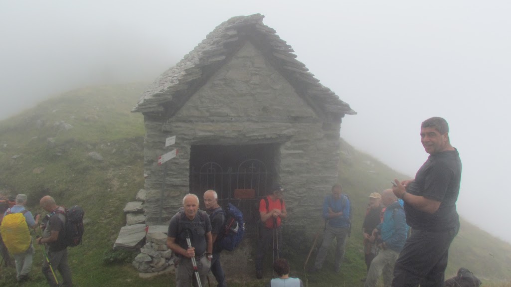 Senza superstizioni oggi siamo in tredici. Una paziente signora sopporta dodici maschietti, quasi tutti al soldo dell’INPS. Ci sono anche degli esordienti. Ritrovo in frazione Pontetto di Montecrestese e si sale ad Altoggio. Di qui, con i permessi richiesti in Comune, proseguiamo oltre Coipo, fino alla fine della strada, asfaltata ma impegnativa. Parcheggiamo all’Alpe Giovera Sopra, 1600. Diretti a nord est, seguiamo l’evidente sentiero A04 che, nel tratto iniziale, attraversa e sfiora bellissimi boschi di faggio, dove incontreremo le ultime tracce della favolosa stagione micologica. Siamo ad oriente della dorsale che ci separa dalla Valle Antigorio, costituita dal Pizzo Osbarino, dalla Cima degli Uccelli e dal Monte Larone. La nebbia che ricopre la Valle Isorno, alla nostra destra, c’impedisce di cercare le “interessanti piste di sci”, a noi ignote, di cui scrive il grande Osvaldo Bevilacqua nel suo libro “Il Paese dei Mille Paesi”. Sarà stato informato male. Qui ci sono solo le tracce devastanti dell’homo idroelettricus, insieme a tanta bellezza. Dolci salite si alternano a lunghi tratti pianeggianti. Dopo 45’ incontriamo un alpeggio diroccato, forse Corte di Dentro, 1841. Un’ora a passo tranquillo e sostiamo brevemente. Poco più avanti il sentiero costeggia per un breve tratto la cresta, che si è abbassata molto, essendo ormai il Larone alle nostre spalle. Ad oriente permane la nebbia, mentre ad occidente un po’ di cielo azzurro ci regala uno scorcio panoramico stupendo, dai quattromila del Sempione al Cervandone. Più avanti incrociamo una traccia che scende a destra verso Agarina. Noi proseguiamo in leggera salita fino all’Alpe Loccia, 2020, in parte diroccata (25’). Qui viriamo verso oriente ed affrontiamo l’ultimo strappo, contornato di caratteristiche guglie di granito. In 45’ arriviamo al punto più alto del percorso odierno, la Cappella della Croce, 2183. Il cartello segnaletico indica erroneamente 2139. Qui il sentiero diventa L03. Iniziale discesa, poi si attraversa in piano fino all’Alpe Lago, 2066, ed al Bivacco Sironi, bello e dotato di locale invernale sempre aperto. Una breve salita ci porta in riva al Lago di Matogno, 2087 (45’), dov’eravamo già passati una settimana fa al ritorno da un’escursione ben più faticosa. Pranziamo fra nuvole e squarci di sole. Il ritorno ripercorre i sentieri del mattino. La risalita alla Cappella della Croce non favorisce a tutti la digestione (45’). In 30’ ridiscendiamo all’Alpe Loccia lungo l’unico tratto di sentiero leggermente esposto. Dopo 1 h 55’ siamo alle auto. Al Circolo di Pontetto anneghiamo in una birra il dispiacere per una giornata meno soleggiata del previsto.