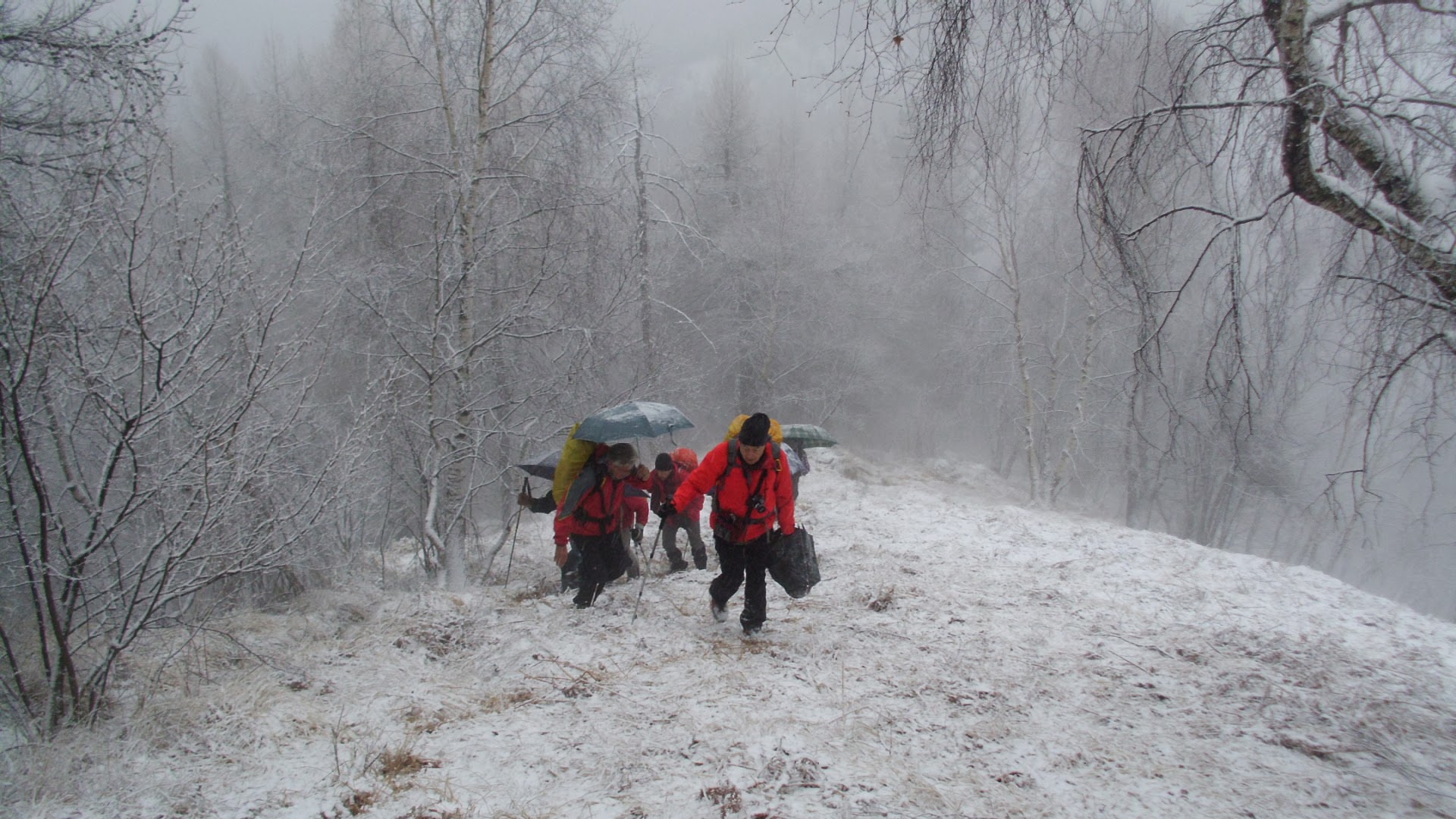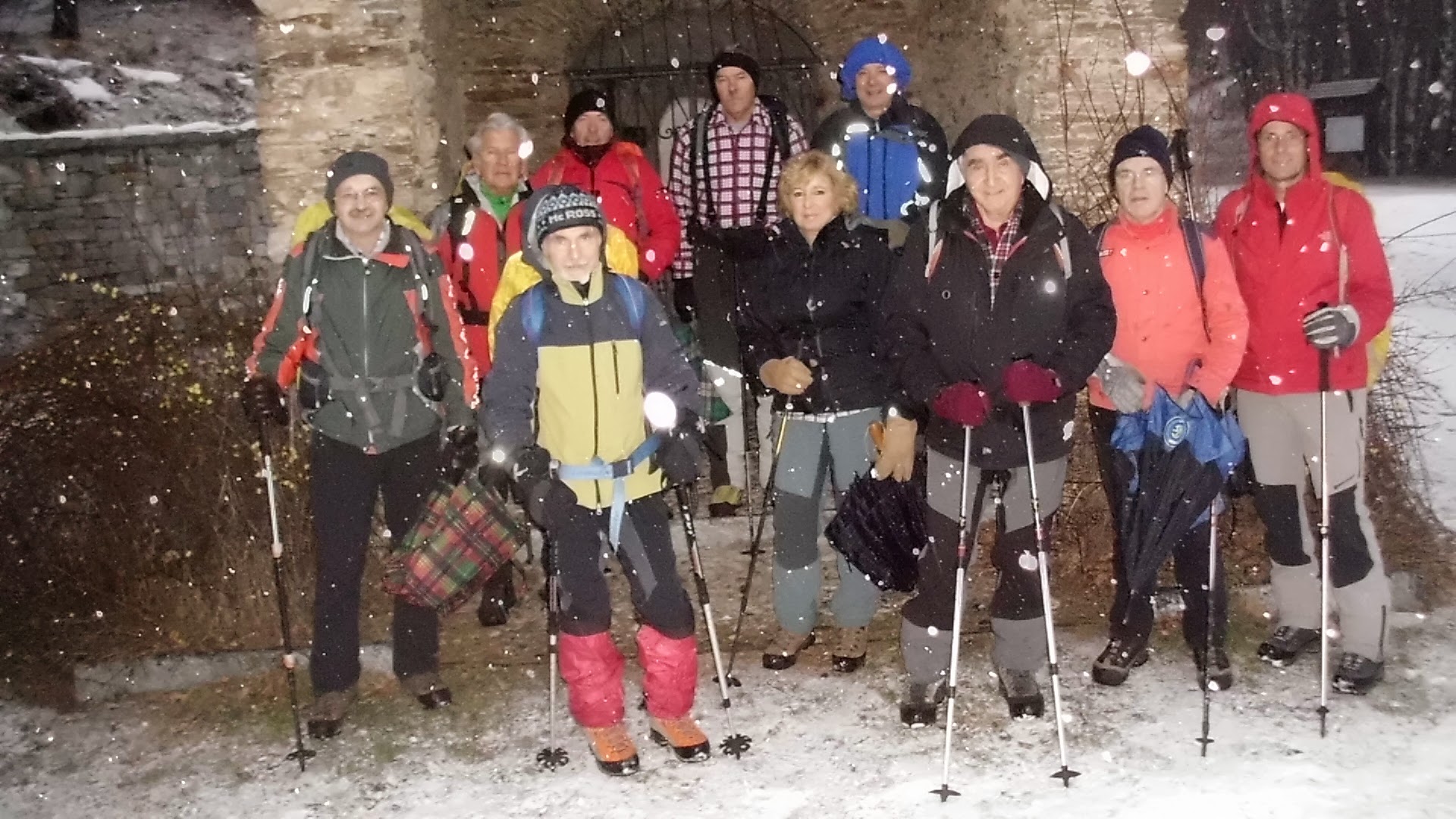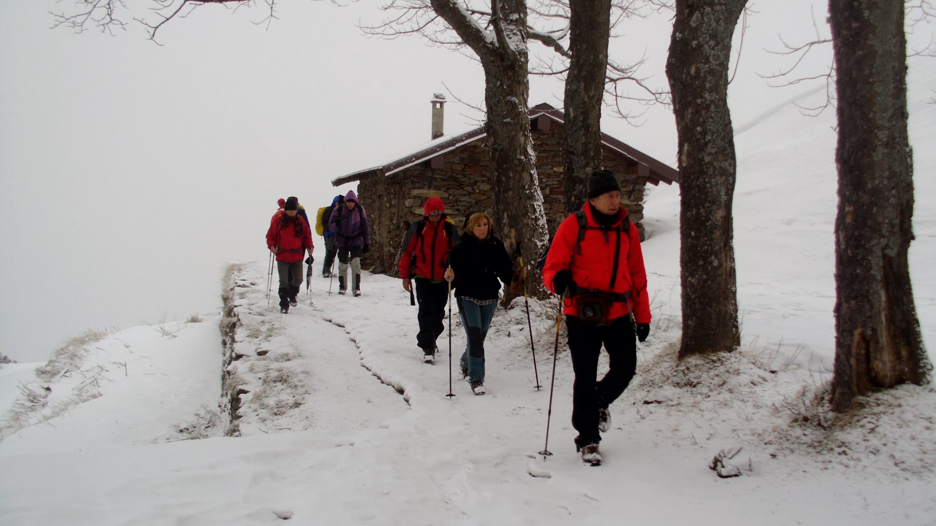 Non par vero che per tre giovedì consecutivi il tempo sia stato bello. Non ci siamo quindi illusi che il sole ci sorrida anche oggi. Ed è così che, come da previsioni, piove e nevica, ma ci vuol altro per fermarci. Ci onorano con la loro presenza il Presidente, ormai il decano del gruppo, e la giovane dottoressa (una delle poche signore del gruppo, ancora molto lontana dalla pensione). Sorseggiamo un caffè a Miazzina, sperando che, nel frattempo, la pioggia conceda una pausa. Infatti, poco dopo, si trasforma in neve, ben più gradita. Sopra l’Alpe Pala il Memoriale degli Alpini ricorda gli eroi morti in maledette guerre. Qui parcheggiamo, a quota 1000 circa. Subito giacche a vento, copri-zaino ed ombrelli. S’imbocca il bel sentiero, per evitare la strada gelata, e si raggiunge rapidamente la Cappella Fina a quota 1102. Si prosegue per l’alpe Cavallotti (1216), dove il sentiero si fa più ripido fino alla splendida dorsale, panoramica in giornate migliori, che separa la Val Pogallo dalla conca del lago Maggiore. La si percorre in direzione nord-est, raggiungendo in pochi minuti la vetta del Pizzo Pernice, 1506, (1 h 45'). Il nostro meteorologo consigliava le ciaspole e, quindi, le abbiamo lasciate sulle auto. In effetti, la nevicata ci concederà due ore di tregua, fino al rifugio, mentre la neve “vecchia” porta abbastanza bene. Dal Pizzo Pernice si perdono circa 100 metri di quota e si arriva alla bocchetta di Curgei. Si prosegue, prima in piano, poi in dolce salita, fino al rifugio e alla cappella di Pian Cavallone (1564). Un sorso di tè caldo al riparo della cappella e l'ultimo strappo ci porta in vetta al Monte Todano (1667), sempre nella nebbia, ma, almeno, non sta nevicando (1 h). Non perdiamo tempo a goderci lo splendido panorama, oggi in sciopero, e, dopo le foto di rito, ritorniamo verso la bocchetta di Curgei. Qui si devia a destra e in dieci minuti, attraversando in leggera discesa un bel bosco di faggi ben innevato (esposto a nord), si raggiunge l’alpe Curgei e l’omonimo rifugio, detto anche Bivacco del Gufo, 1350 (45'). Questo comodo rifugio, di proprietà della Pro Loco di Miazzina, è un raro esempio di come dovrebbero essere anche tutti gli altri: sempre aperto, ben tenuto e fino ad ora anche rispettato da chi frequenta queste zone. Nella vicina Confederazione sono tutti così, mentre in Italia, per colpa di una piccola minoranza di incivili, spesso non è possibile che i rifugi incustoditi restino aperti. Noi, che siamo un gruppo di veri amanti della montagna, lo lasceremo perfettamente pulito ed in ordine, contribuendo anche, com’è ovvio, alle spese di gestione. Oltre alla montagna, amiamo anche il buon cibo e gustiamo moltissimo il risotto con funghi che il nostro grande cuoco, insieme a due prestigiosi aiutanti, ci ha preparato, rinunciando a parte dell’escursione. I funghi sono procurati da un fungiat professionista del gruppo, che li ha raccolti durante le gite autunnali. Mentre pranziamo riprende a nevicare ed apprezziamo ancor di più il caldo ed il cibo. Dopo due ore di totale ed allegro relax risaliamo pigramente alla bocchetta di Curgei, sotto una tranquilla nevicata (50 m di dislivello, ma a pancia piena!), e di qui scendiamo alle auto lungo il sentiero più diretto (1 h 30’). Un po’ di neve fresca ed il ghiaccio ci inducono alla giusta attenzione. Ripartiamo verso casa, mentre la neve si trasforma in pioggia.