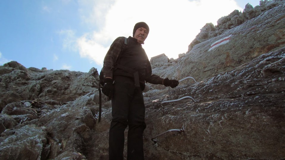 Su questo versante ovest a quest'ora non batte ancora il sole e le cime leggermente imbiancate danno vita ad uno scenario surreale, nel contesto di un panorama stupendo, che ci gustiamo facendo colazione. Breve tratto in leggera discesa e calziamo i ramponi per risalire un nevaio ripido con neve molto dura, dove occorre la giusta attenzione per le scariche di sassi, soprattutto quando si alza la temperatura. A fine nevaio inizia un tratto attrezzato con scalette e catene per facilitare la risalita. Tutto facile, ma c'è ghiaccio anche sui gradini d'acciaio e qui ci dividiamo.