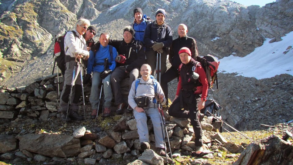 Finalmente s'inizia a salire veramente per combattere un po' il freddo e l'umidità che ci entrano nelle ossa, alla faccia di Meteosuisse. Camminiamo da un'ora quando incontriamo i ruderi delle baite di Scheene Biel, 2268. Siamo nell'anfiteatro di Furggubäum, che dà il nome alla bocchetta ed alla punta, per noi “d'Aurona”. Continua la lotta fra nebbia e sole. Finalmente, dopo due ore di marcia, il sole la spunta, a quota 2500 circa, dove incontriamo un rudere in prossimità di un laghetto semi-ghiacciato. Ieri, a quest'altezza, c'è stata una leggera spruzzata di neve che, nella notte, si è trasformata in ghiaccio.