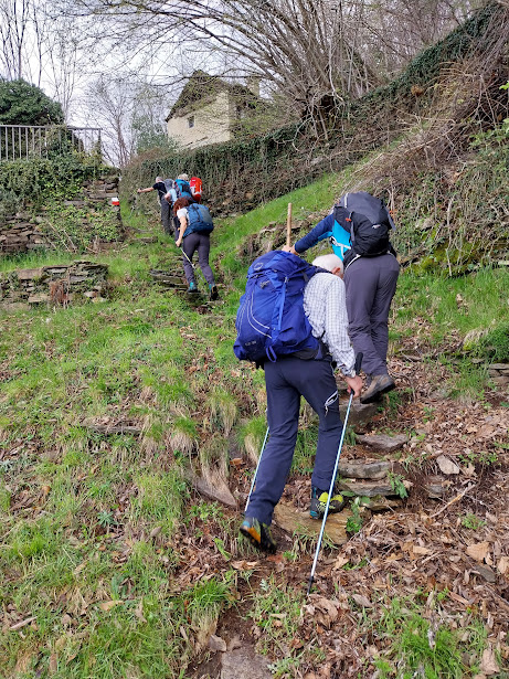 A sinistra del campanile di Cosa inizia il sentiero che supera su un ponte di ferro il Rio Robana, oggi ricco di acqua. Sopra di noi, alla nostra destra, forma una bella cascata. Il primo tratto è ripido, con gradini scavati nella roccia, e favorisce il risveglio muscolare. Dopo una cappelletta il pendio si addolcisce e camminiamo nel verde, fortunatamente ancora in ombra, perché la bella giornata lascia prevedere, più tardi, temperature più che primaverili. A quota 485 raggiungiamo Ca' Burtulina.