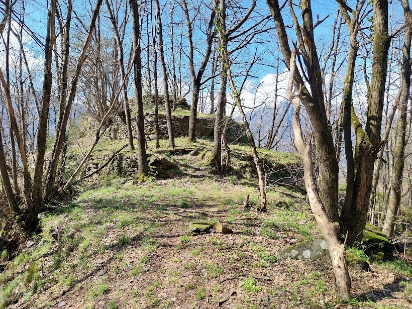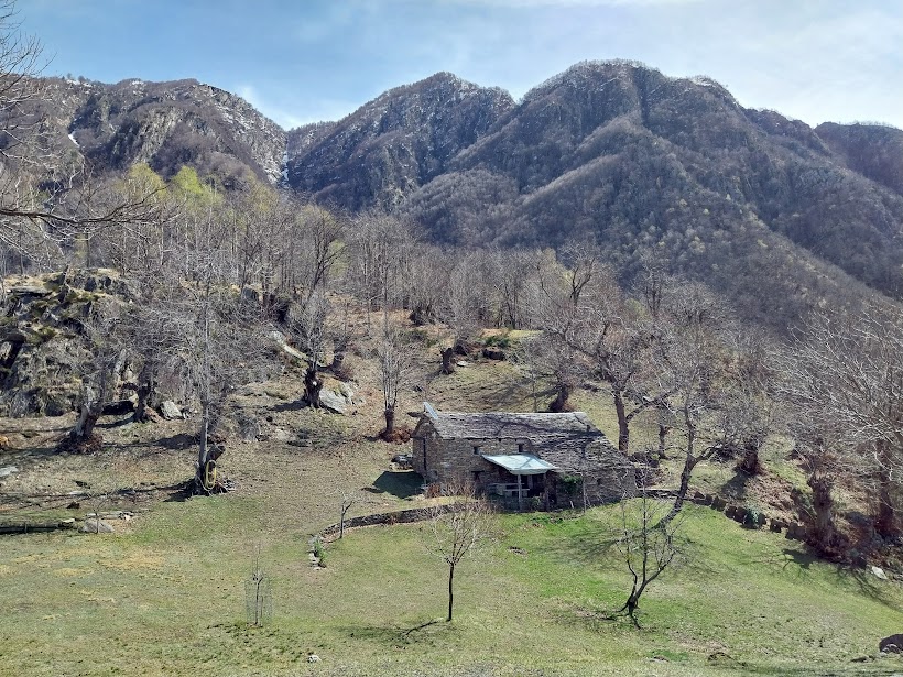 I panorami sull'Ossola sono sempre più spettacolari con tanta neve sopra i 1600 metri. Siamo sull' “Itinerario da Cosa a Cosasca tra luoghi di culto e insediamenti antichi”, come recitano i cartelli indicatori. Dopo tre quarti d'ora di cammino effettivo siamo a Cosasca, 550. Giriamo ammirati per l'antico borgo, in ordine, pulito, dove c'è vita. Proseguiamo verso nord fino al Santuario della Madonna delle Grucce, ristrutturato in stile “moderno”, e riprendiamo a salire su terreno più aperto fino all'Alpe Prà Lavarda, 775 (tre quarti d'ora). Ci domina a oriente la splendida dorsale sulla quale si trovano l'Alpe Drisioni e l'Alpe di Nava, quasi mille metri più in alto.