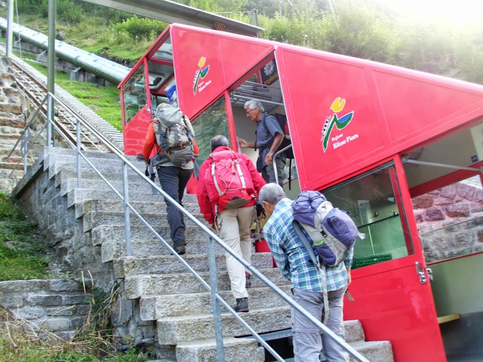 Previsioni meteo discrete incoraggiano ad una levataccia per intraprendere un lungo viaggio, fino a Piotta, canton Ticino, pochi chilometri prima del tunnel del Gottardo. Ci arrivo da solo, in due ore, e mi trovo con sette amici verbanesi alla partenza della funicolare più ripida d'Europa (817 x 1000), che in quindici minuti porta da quota 1000 alla quota 1793 di Piora. Ci sarebbe anche una strada stretta e regolata da orari ben precisi, ma preferiamo l'avventurosa salita nella cabina rossa, che sconsiglio a chi soffre di vertigini e a chi ha poca fiducia negli ingegneri meccanici e negli acciai confederali.