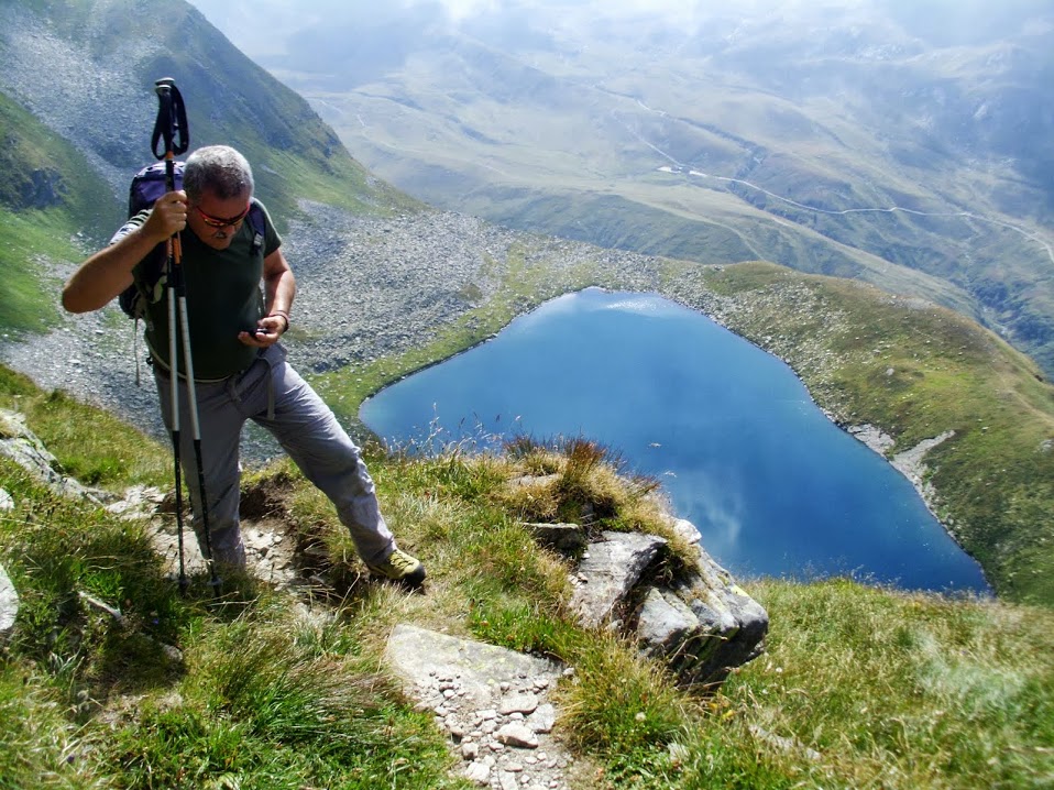 In poco più di un quarto d'ora, lungo strada asfaltata, raggiungiamo la diga del grande lago del Ritòm, 1850, il più esteso dei dieci che oggi sfioreremo, non contando la miriade di piccole pozze d'acqua o di laghetti nascosti alla nostra vista dai rilievi della zona. Il sole fa capolino fra molte nuvole, che, nel primo pomeriggio, ci lasceranno uno splendido cielo azzurro e limpido. Sempre su strada ed in direzione est costeggiamo tutto il lago, che è alla nostra destra, alla cui fine ci inerpichiamo dolcemente fino a Cadagno di Fuori ed all'omonimo lago, 1921, che lasciamo alla nostra sinistra (quasi tre quarti d'ora).