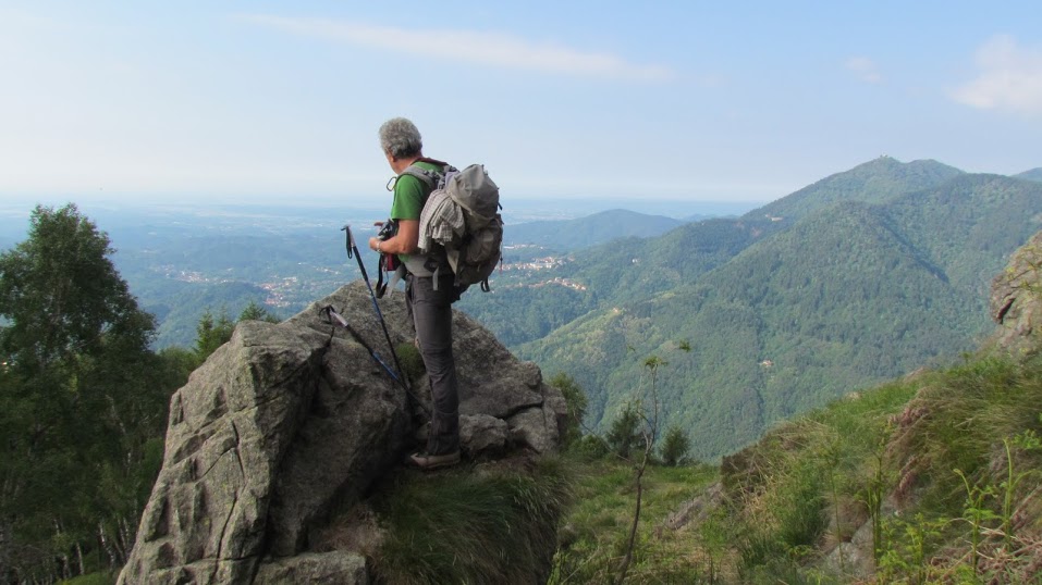 Peccato per le nuvolette sui rilievi, ma di qui, se fosse limpido, si vedrebbe tutta la corona alpina dal Monviso al Bernina e all'Adamello, ed anche tutta la pianura. Verso sud ovest, senza sentiero, lungo prati ripidi e ghiaioni, scendiamo al Bivacco dei Cacciatori all'Alpe Solivetti, 1700 circa. Di qui ci dirigiamo ad oriente ed arriviamo al Rifugio Monte Barone (un'ora), 1587, del CAI Valsessera, in prossimità dei ruderi dell'Alpe Ponasca.