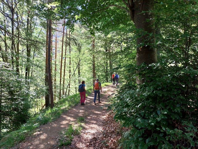 Torniamo sui nostri passi fino ad un bivio dove prendiamo il sentiero a sinistra della pista, che la costeggia più in basso e ci riporta ad un comodo attraversamento del Rio Ferro. Abbiamo perso poco più di un quarto d’ora e qualche decina di metri di dislivello. Sulla sua destra orografica il sentiero evidente sale in un bosco di faggi. Una veloce colazione e, dopo un’ora e mezza di cammino effettivo, pause ed errore di percorso esclusi, arriviamo al bel prato dove sorge il Rifugio L’Alpino, 1274. E’ chiuso e si devono richiedere le chiavi, ma ci si può “rifugiare” nel ricovero invernale. Breve pausa e nessuno ha dubbi sul proseguire. Vedendo il ripido versante che ci aspetta, il decano del gruppo, che anche oggi sono io (ahimè!), alleggerisce un po’ lo zaino, suscitando alcuni commenti non riferibili, Diretti a est, sempre sul sentiero M22 che qui fa parte anche dell’Alta Via del Gridone, guadiamo il Rio del Negro e risaliamo il ripido versante, dove sembro faticare solo io: che forti i miei amici, soprattutto le badanti!