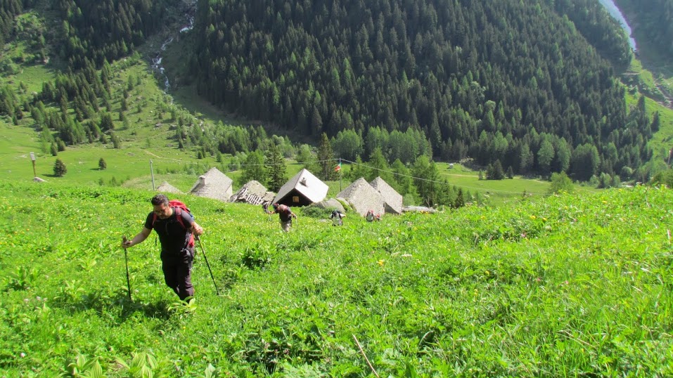 Ci spostiamo con cautela per le foto di gruppo e spunta una corda dal fondo di uno zaino. Recuperiamo i tre saggi in bocchetta e scendiamo, su ripidi prati e poi nel bosco, in direzione sud est, all'Alpe Salecchio (non Salecchio!), 1865 (mezz’ora) . Diretti a sud scendiamo all'Alpe Cortic, 1662. Di qui viriamo a nord est (stiamo chiudendo il cerchio), in leggera discesa e con dolci risalite, fino a quota 1600, appena sopra Case Francoli, 1555. Dopo un’ora dall’Alpe Salecchio chiudiamo l'anello al Motto.