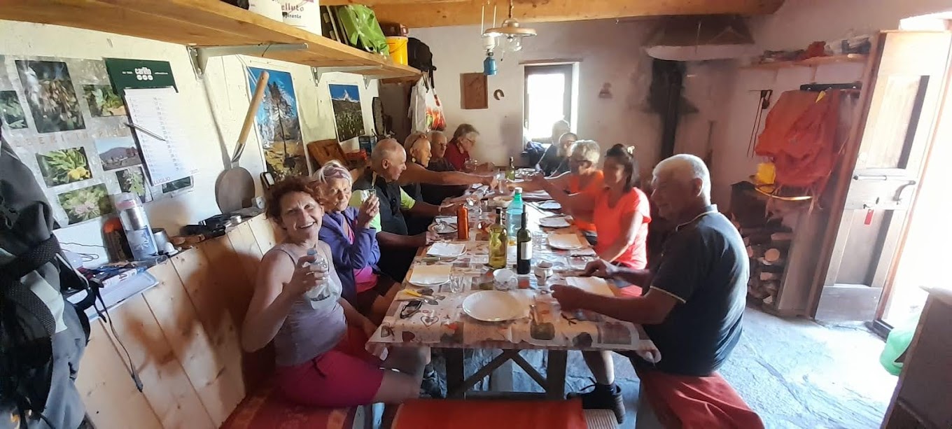 Gli amici pazienti ci aspettano in vetta, 2195, (un'ora e mezza per i ritardatari), e qui si festeggiano due prime salite al Laurasca, il panorama spettacolare, la bella compagnia ed un sublime bianco della Provenza il cui peso è forse stato una delle cause dei crampi. In discesa alcuni passano dall'Alpe Scaredi, altri svoltano a destra un po' troppo presto e si inventano un nuovo percorso di discesa a Cortevecchio (un'ora e un quarto). Qui a tavola il tempo vola e scendiamo “un po'” sul tardi (un'ora e un quarto). Ci resta il tempo di celebrare gli ottant'anni dell'amico che mi disse, sotto sforzo, una frase che mi ha insegnato molto: “Dai ch'ai catum!”.